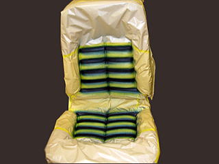 ブラックに見えるストライプも、汚れを落としてみるとネイビーのお色でしたので(三段目;左の写真)丁寧にマスキングをし(上から三段目:右の写真)、二色ともカラーリングを施し仕上げました。